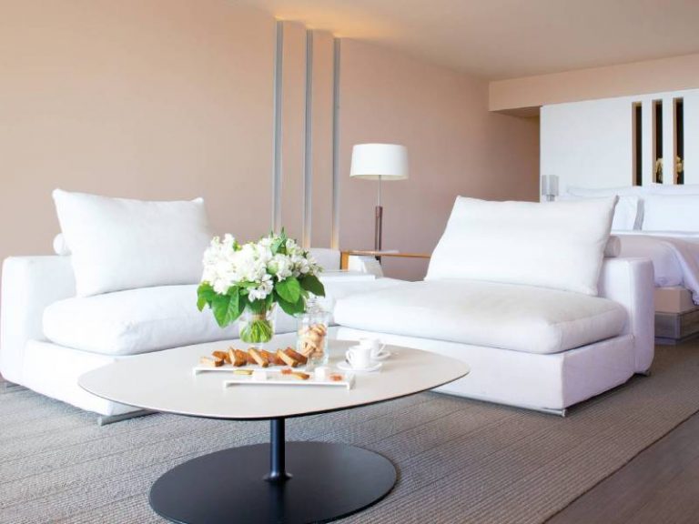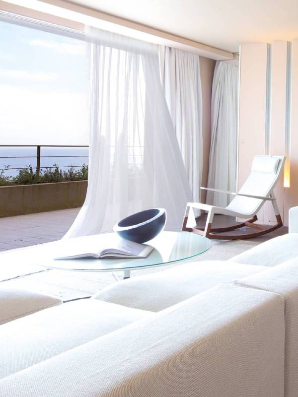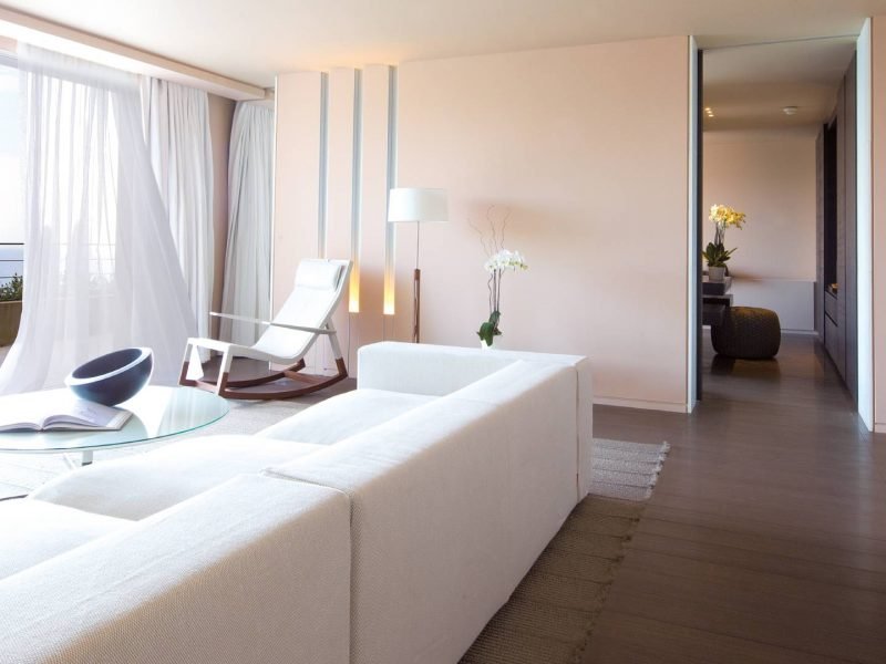 The Deluxe Junior Suite’s generous 80m² space is adorned in powdery mineral hues, emphasized by the warm colors of the floor and contemporary light effects. The room, extended by the living area, opens onto a large 60m² terrace offering a simple and intimate face-to-face encounter with the Mediterranean. The light, spacious bathroom has a shower and whirlpool with sea view.