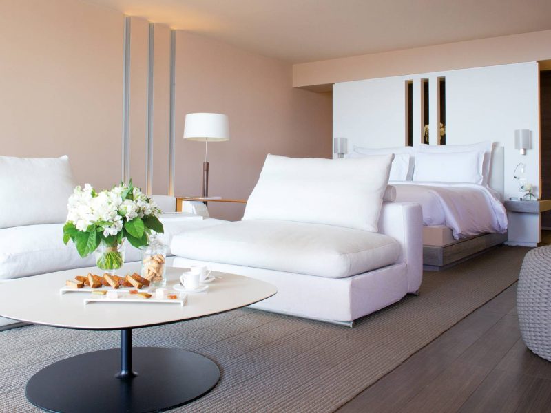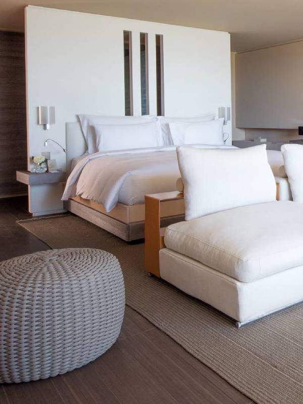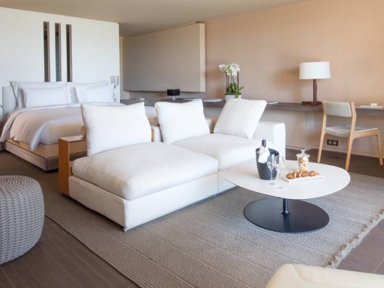 The infinite blue of the sea catches the eye like a magnet. No matter what the time of day, one never tires of admiring the horizon from the terrace armchairs or the private garden with its extensive greenery. Alternatively, you can enjoy this view of the Mediterranean from the bathtub in the magnificent bathroom, generously embracing the outside. The bedroom and living room area combine furniture featuring crisp, clean lines with a palette of light and natural tones, from the ivory sofa to the white curtains.