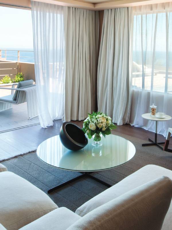 The Taillat Suite provides a unique, magnificent encounter with the Mediterranean. Imagine the blues of the sky and sea, the sun, the wild coast, the garrigue (scrubland) enhanced by the sheer simplicity of a streamlined, elegant décor. The 170m² corner terrace, enhanced by sunbeds and a large outside living area, is the perfect complement to the living room and bedroom of this exclusive 90m² suite. Designer furniture, a softly luminous color scheme, large picture windows and generous spaces all combine to create the almost magical atmosphere of the Taillat Suite. The spacious bathroom, consisting of a shower and bath, also offers a magnificent view over the Mediterranean.