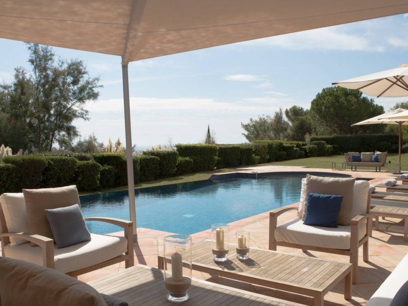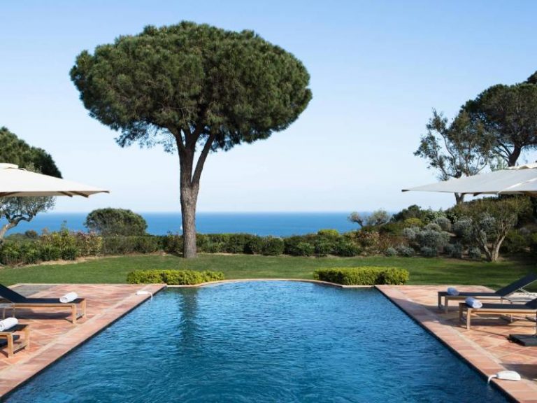 This single-story residence (apart from one upstairs bedroom with a Tropezian roof terrace), has a charming patio, overlooking the lounge that opens onto the terrace facing the pool and a full sea view. The six bedrooms comprise 2 master bedrooms and four double rooms.